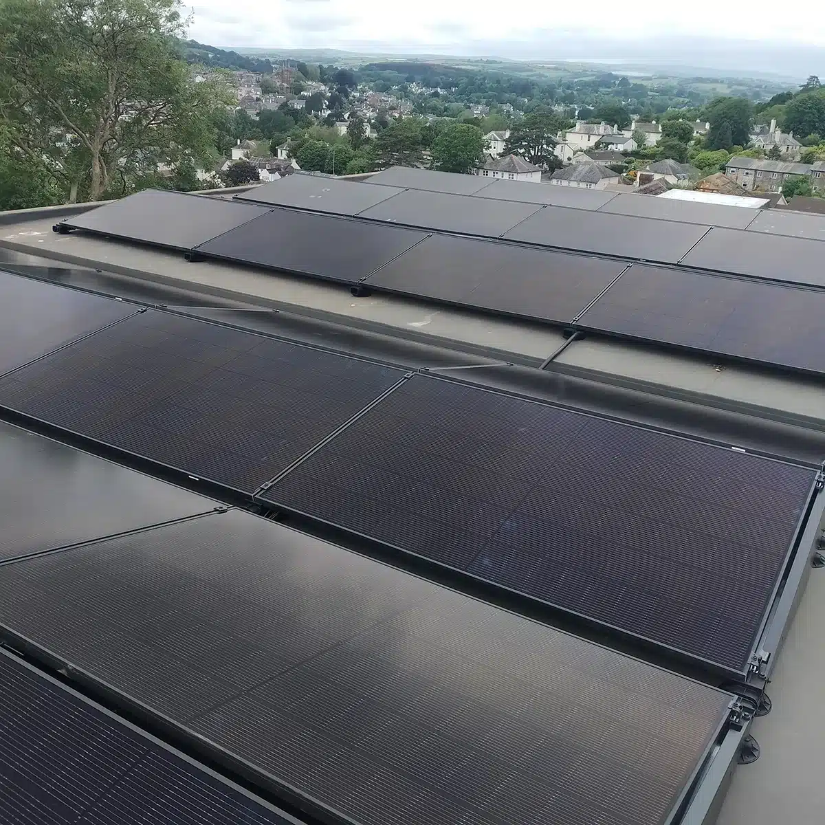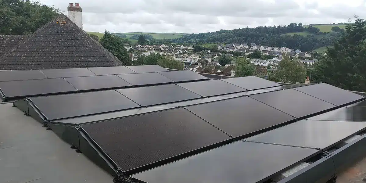 A passivhaus in the centre of Totnes needing solar to offset electricity usage. We designed a flat roof system combined with battery storage an EV charger and a hot water diverter. The system was also fully optimised and had a backup box allowing the house to switch over to running off the battery and solar in the event of a power cut.
